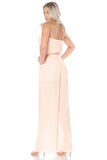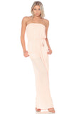 Be the dazzle of any room in this sexy sleek chiffon jumpsuit. With just the right amount of sexy you've been looking for. With a strapless top, lining, wide leg bottom, tie and pockets it has the perfect flow.