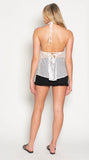 The MALIBU crochet white stunning halter with lace up detail. Plunging neck line. Bring out your hotness this summer!