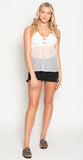 It’s all in the details featuring a daring cross cross neckline. Body is crochet-with Crochet lace trim, self-tie cami straps that cross and lace-up at the back. Sexy comfortable, relaxed silhouette.