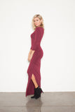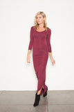 The color of the season, and possible beverage of the year. Our wine 3/4 sleeve dress with the calf slit an uber soft jersey blend you won't be able to get enough. Sexy ruching details add comfort and curves.