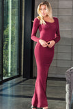 The color of the season, and possible beverage of the year. Our wine long sleeve dress with the calf slit an uber soft jersey blend you won't be able to get enough. Sexy ruching details add comfort and curves.
