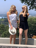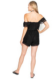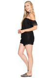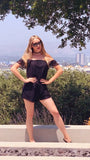 Feel sexy & flirty in this black crochet romper is a must have! With a strapless top, ruffle sleeve, tie and pockets it has the perfect flow. Romper is lined.